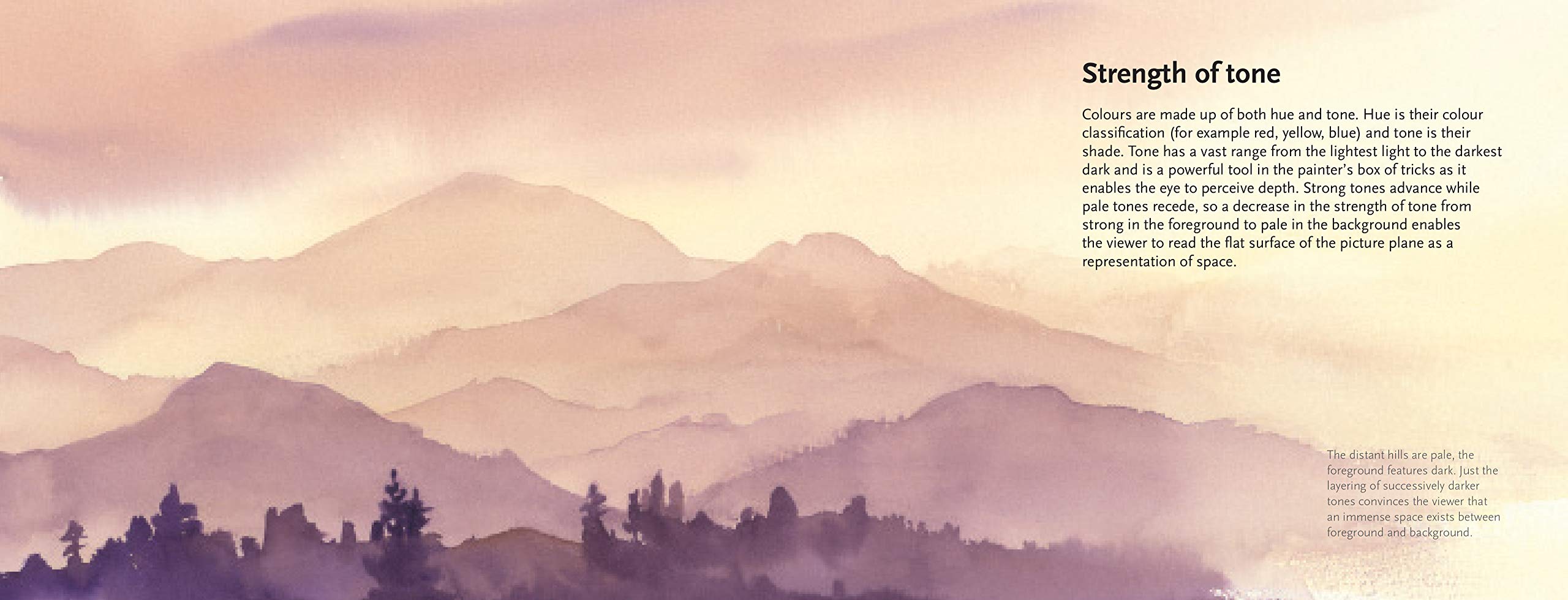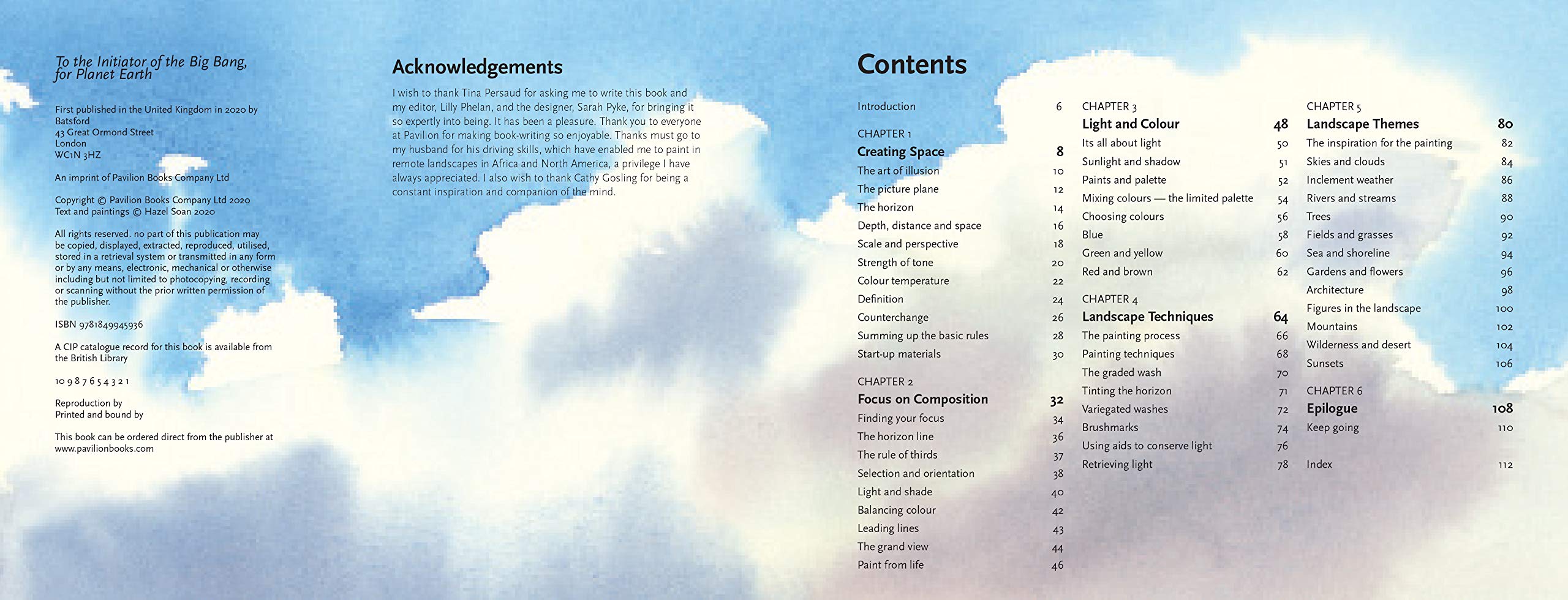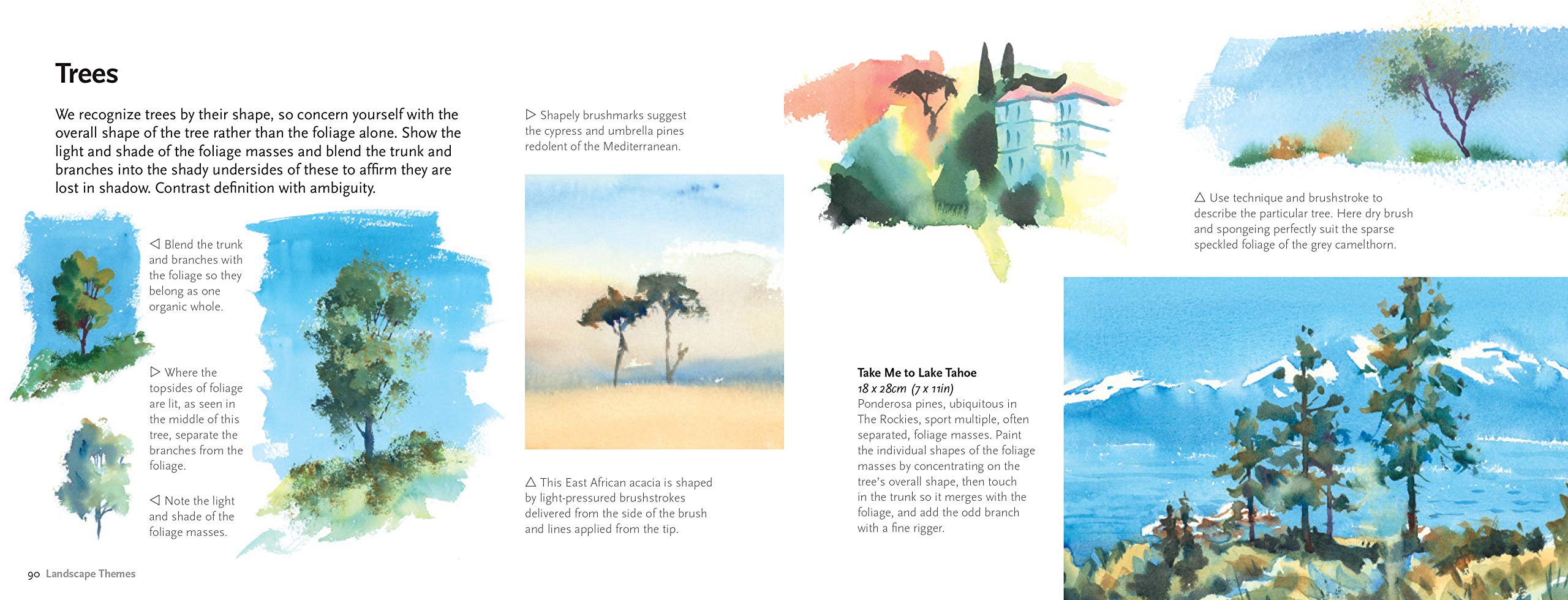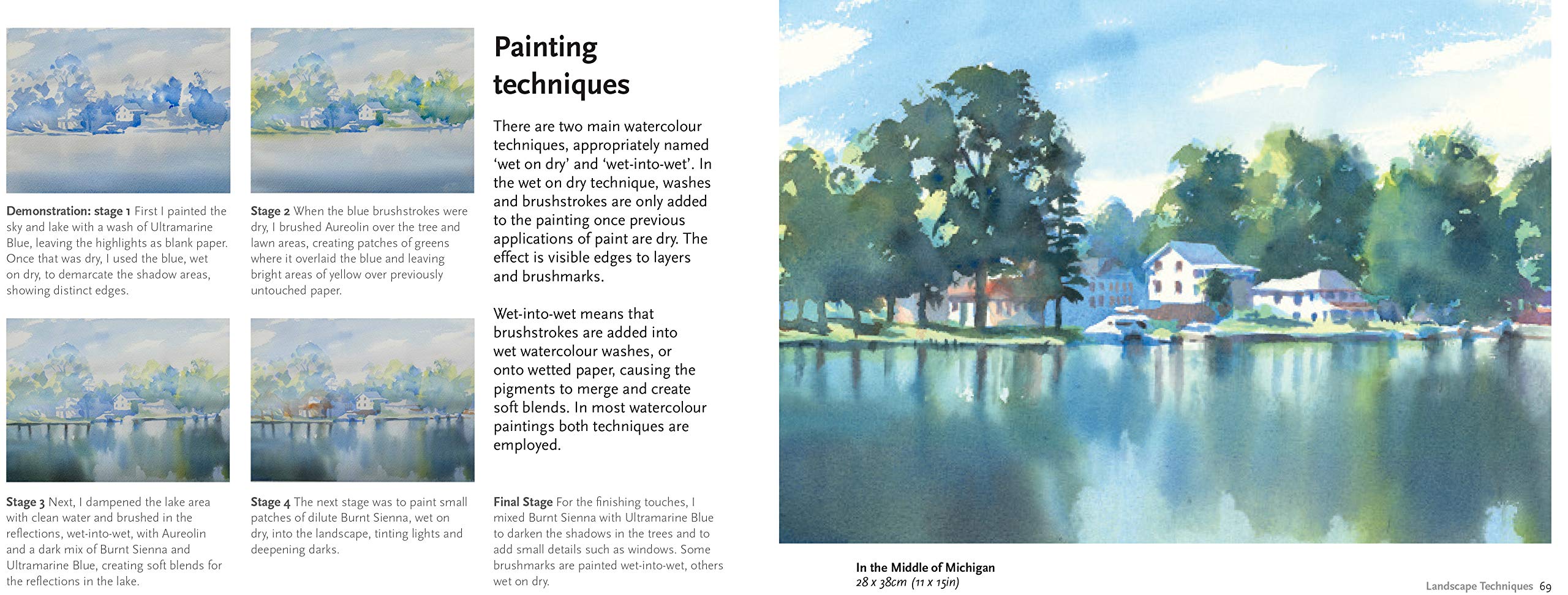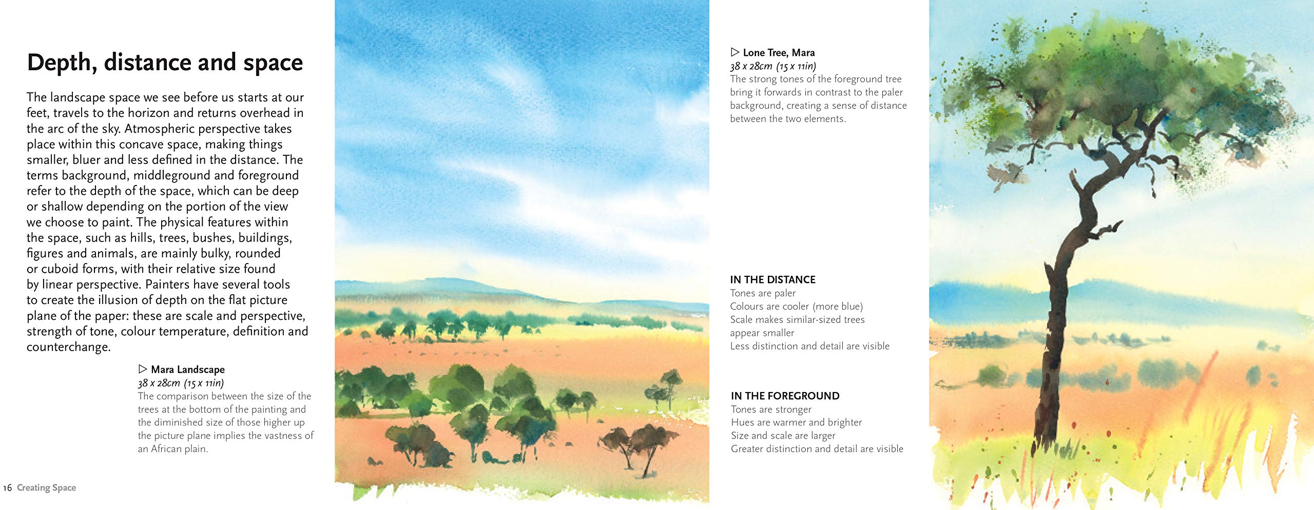 Topics covered include creating space, composition and focus, light and shadows, colours of the landscape and the mixing of watercolours. Watercolour painting techniques such as painting en plein air, brushwork, creating texture, wet into wet and wet on dry are explained. The book also explores specific landscape themes such as skies, foliage, forests, gardens, seascapes, wilderness, sunsets, urban landscapes, panoramas, sunsets and many more.