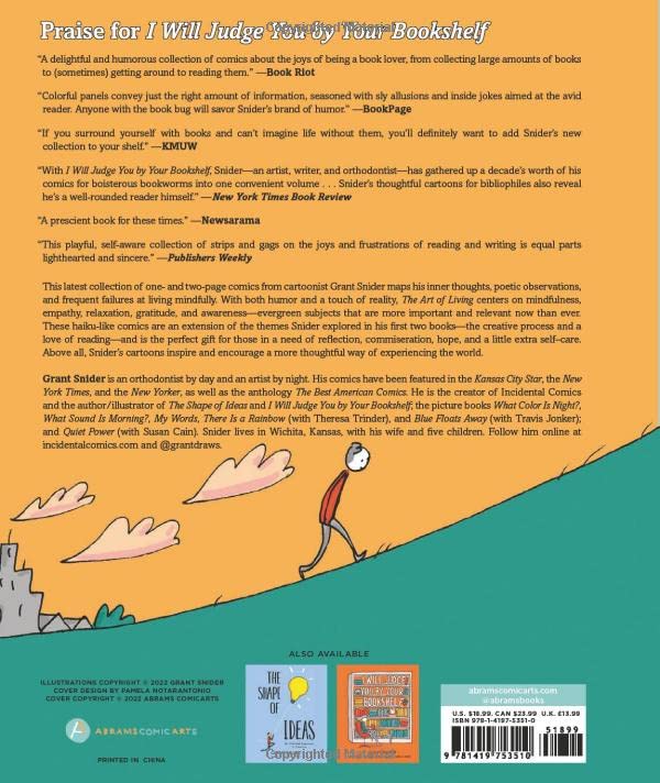 A humorous, uplifting look at mindfulness, from beloved illustrator Grant Snider“Find a quiet spot away from all distraction / Listen to your breath / Watch your thoughts float past you / Forget the obligations of today / Try not to consider your eventual decay / Let yourself drift away / Arise, connected with the Earth / Awakened to the Universe.”“Mindfulness” is a buzzword bordering on the cliché, with books filling the shelves of any indie bookstore you step into. Although clichés remind us of the familiar and the commonplace, they take on new meaning and greater significance when presented in a fresh new way. In The Art of Living, cartoonist Grant Snider, author of The Shape of Ideas and I Will Judge You by Your Bookshelf, has created an all-new collection of one- and two-page comics that map his inner thoughts, poetic observations, and frequent failures at living mindfully. With both humor and a touch of reality, The Art of Living centers on mindfulness, but also empathy, relaxation, gratitude, and awareness―evergreen subjects that are more important and relevant now than ever. With a striking package that includes a die-cut cover, The Art of Living is an extension of the themes of Snider’s first two books―which explored the creative process and the love of reading―and is the perfect gift for those in a need of reflection, commiseration, hope, and a little extra self-care. Above all, Snider's cartoons will inspire and encourage a more thoughtful way of experiencing the world.